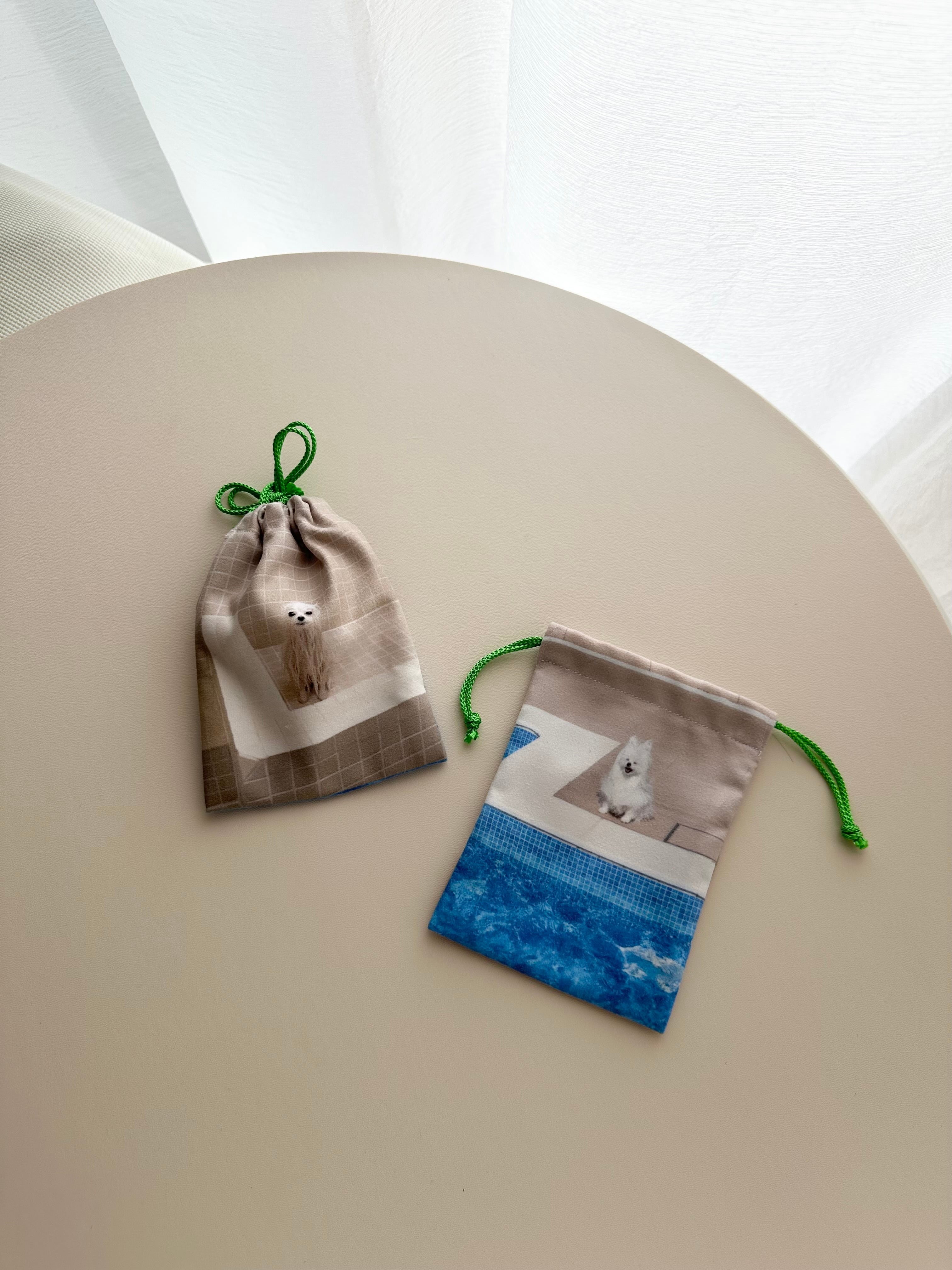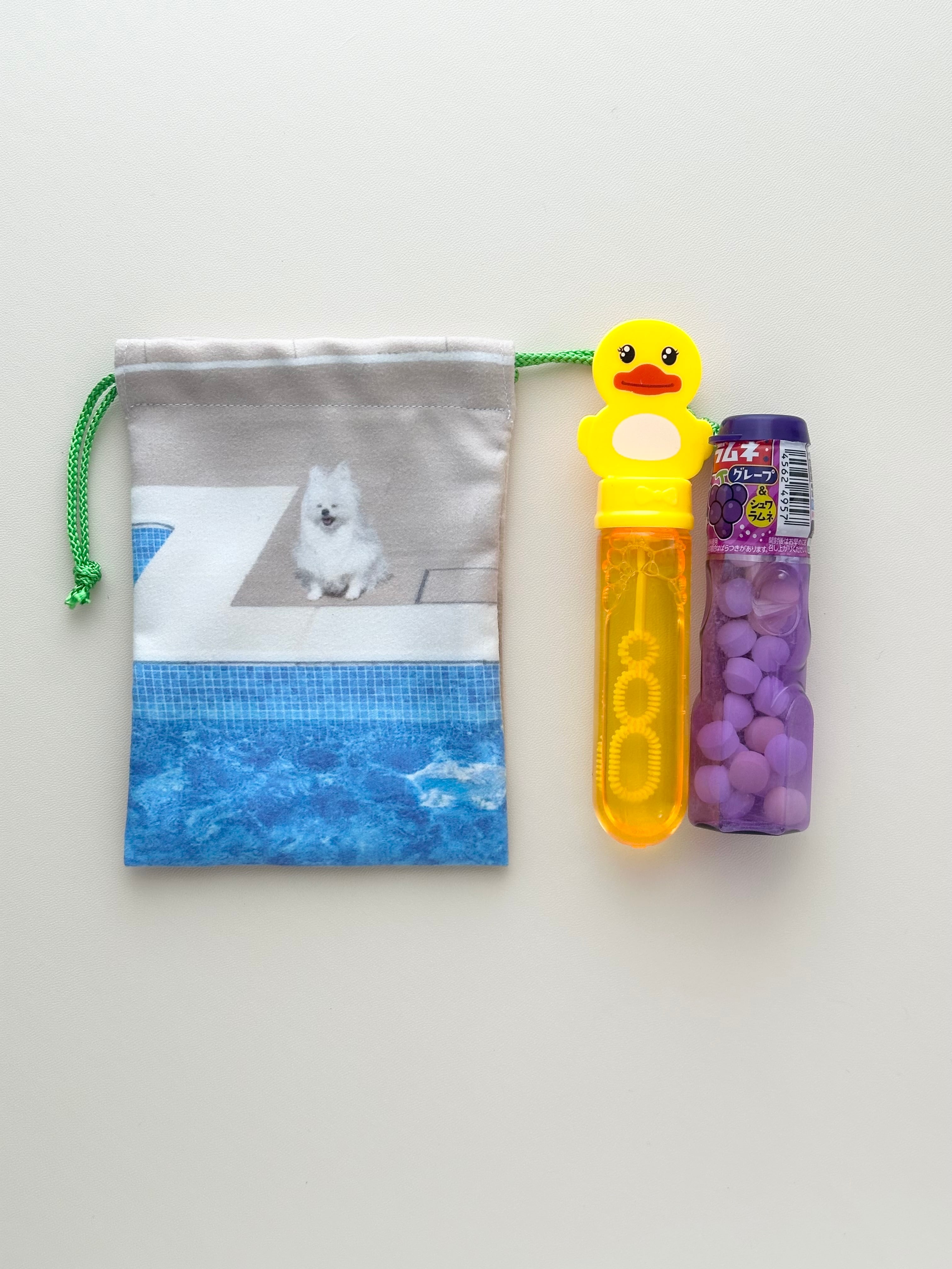 水辺の犬がプリントされた、夏のきんちゃく!
