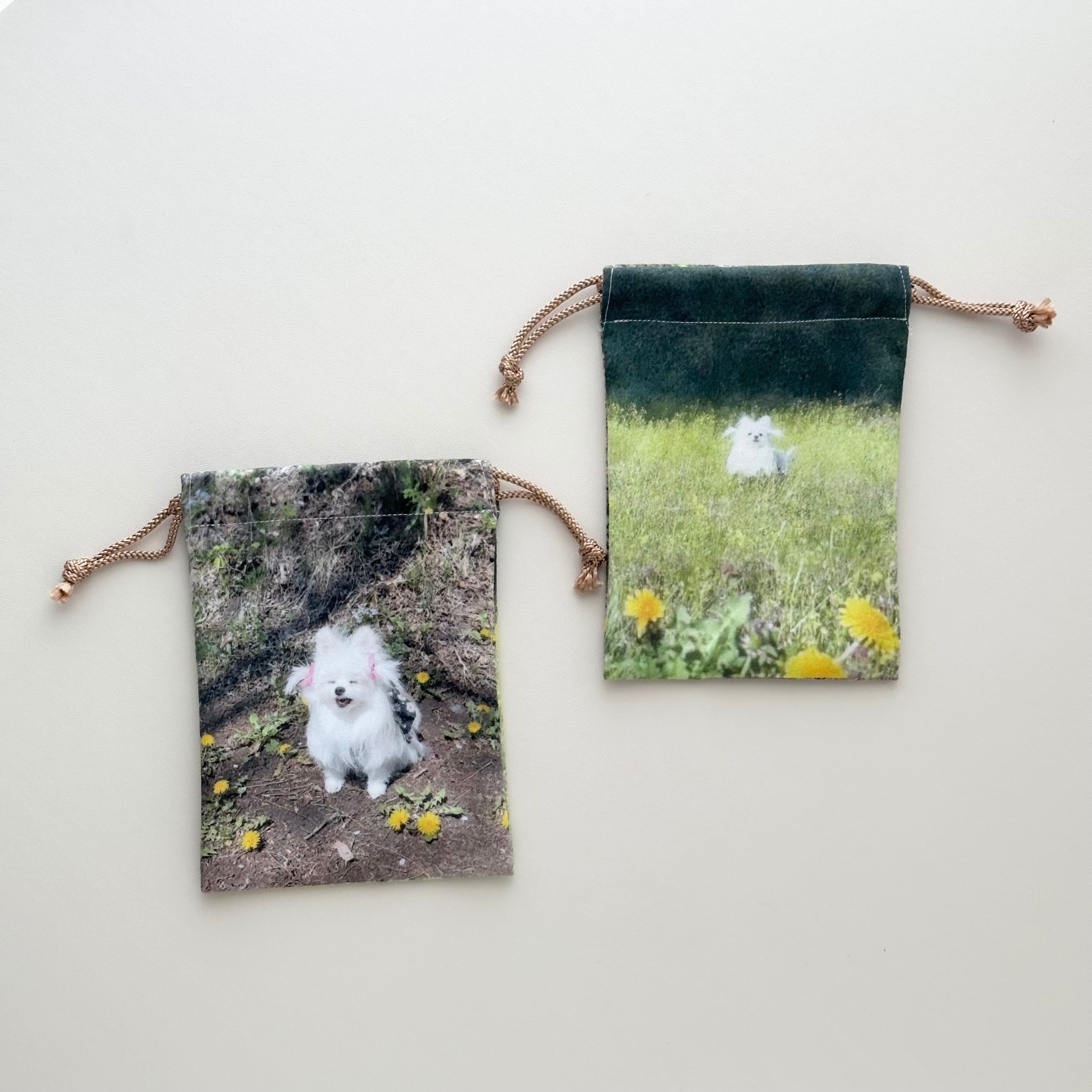 野原の犬がプリントされた、春のきんちゃく!